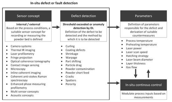 Concept for in situ defect or fault detection, including sensor concept and defect detection, either by exceeding defined thresholds with a specific measurement method, e.g., laser profilometry, or via image recognition based on deep learning, e.g., anomaly detection. As a non-part of this study, the connection to the next conditional points of a complete process monitoring is then presented. The parameters that are responsible for the defect and the derivation of suitable countermeasures and continuous interaction with in situ process control to modulate process inputs based on measurements.