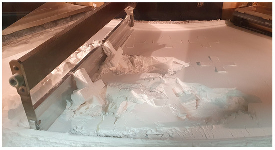 Regarding the failures and defects that can occur in the processing of polyamides as well as metallic powders, there are synergies as well as independent effects. In addition to similar defects like curling, shrinkage, coating failures, part shifting, particle drag, powder contamination, and powder short feed, the manufacturing of metal powders might lead to additional defects like cracks, spatters, and porosity [25,33,34]. Figure 2 shows the effect of part shifting during the ongoing sintering process in the FORMIGA P 110 PBF-LB/P system via the EOS (Krailling, Germany) used for this work. As can be clearly seen, this event immediately leads to a complete stoppage of the build job.