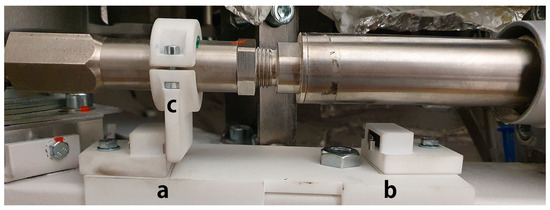 Definition of the end position of the coating blade. Two switches (a) and (b) have been installed inside the machine to be activated when the actuator (c) of the coater spreads a new layer of powder.