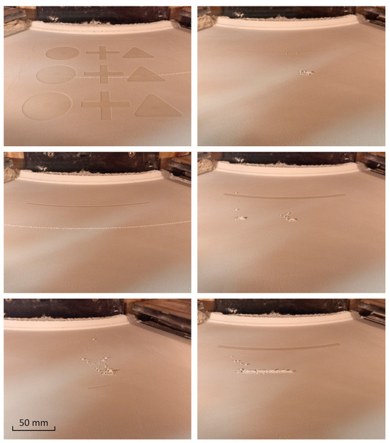 The Bowden cables were routed inside the machine and then exited through a customized inspection hatch on one side of the machine. The mechanics were driven via two stepper motors using a lever system, which enabled very precise programming and control. The system could be used continuously under real conditions during the sintering process to produce a variety of coating defects, as shown in Figure 7.