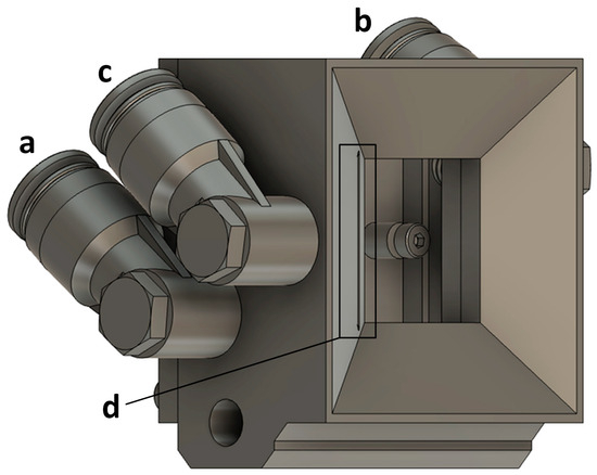 The CAD Design of the cooled camera housing. The N2 inlet (a), the outlet (b), the return (c), and the flushing of the lens via the air knife (d) can be seen. The housing consists of two parts that are screwed together and sealed with heat-resistant material. The camera is positioned and fixed inside the housing with screws.