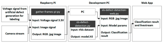 The applied interface structure with three main functional blocks to implement real-time defect detection. The Raspberry Pi implementation is responsible for capturing frames from the stream and automatically labelling them using an external signal. An RGB .jpg image is then generated as output and sent to the developer PC. The data is then processed on the developer PC and the custom CNN model. The classification result and livestream are then displayed in real time via the web application.