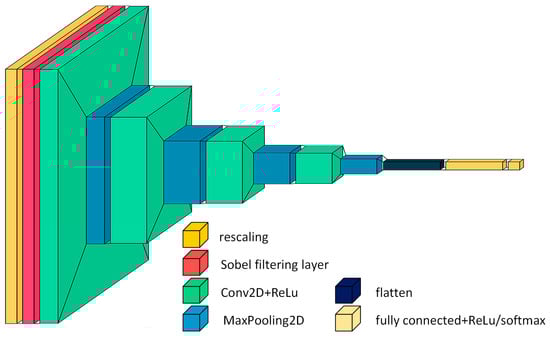 Final model architecture. After the rescaling layer, the Sobel filtering layer was implemented. Compared to the base model architecture, this final iteration of the CNN also uses an additional Conv2D convolutional layer and ReLu activation function, and another MaxPooling2D layer for non-linear down sampling.