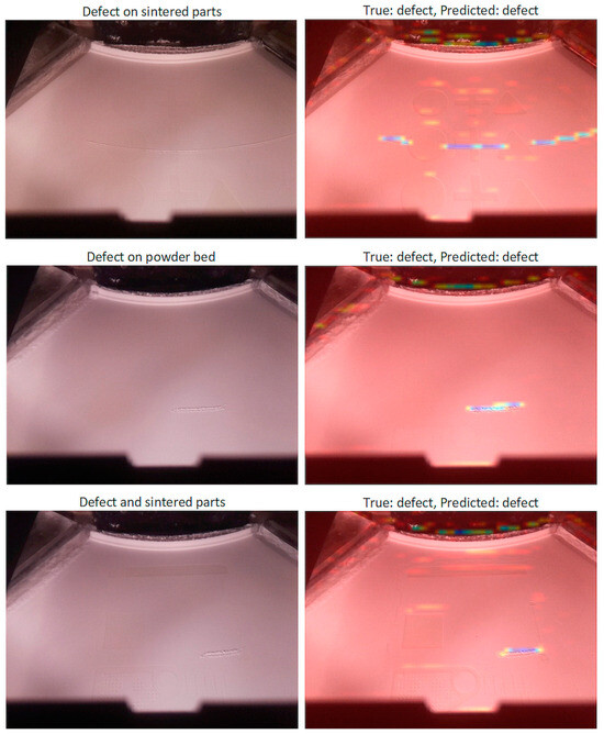 In order to assess the actual usability of the custom CNNs used, a random comparison of the original frames with the Grad-CAM heat maps was performed, as shown in Figure 14. As can be clearly seen, all images without defects were classified as “True: ok” and “Predicted: ok”. In contrast, the images with a detected defect were classified as “True: defect” and “Predicted: defect”. During the various build jobs carried out as part of this work, attempts were also made to produce component geometries that looked as close to a defect as possible, and these geometries were also not classified as defects according to the Grad-CAM heat maps.
