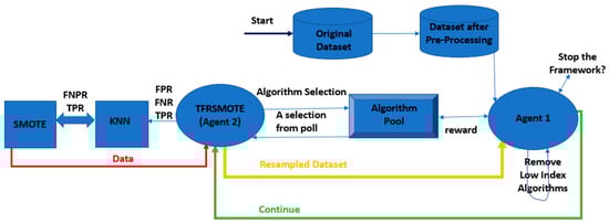 In this research, multiagent reinforcement learning (MARL) is used as it offers advantages over single-agent reinforcement learning (SARL) in complex scenarios [15]. MARL allows multiple agents to learn and make decisions concurrently, capturing nuanced interactions and dependencies among agents. Therefore, in the integrated RL environment of RLFOUA, two agents collaborate to optimize the algorithm selection and resampling processes. The functional agents in RL start with a preprocessed dataset. Then, they integrate it within a pipeline combining a machine learning algorithm, an oversampling method, and an undersampling technique. The goal is to produce a model capable of detecting attacks in a general dataset. In each iteration, the first agent chooses a pipeline generated from Algorithm 1, trains the machine learning algorithms after resampling within the pipeline, and calculates the reward based on the resulting performance. Concurrently, the second agent, called TFRSMOTE (proposed resampling algorithm), performs dataset resampling.