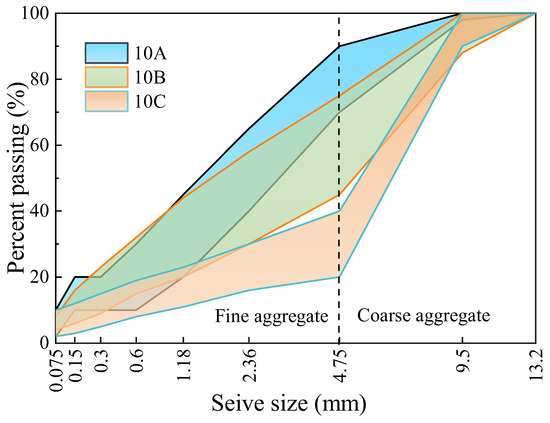 The mineral gradation of a stress-absorbing membrane interlayer can be mainly classified into two types: 5-type [29,30] and 10-type [28,31,32,33,34,35,36,37,38] gradation, with the latter being more prevalent. The 10-type gradation is mostly continuous, and all levels of gradation intersect and overlap with each other. The gradation curve analysis showed that the CAM [31] gradation had a gap at 0.15 mm sieve. The gradation of all levels had a significant difference in the passing rate of 4.75 mm sieve. The CAM, JTG F40-2004 [28], and DBJ/T13-147-2012 [38] had a higher passing rate of 4.75 mm sieve than the other gradations. Therefore, three types of type-10 gradations were classified as 10A, 10B, and 10C, as shown in Figure 1. The test gradation is shown in Figure 2.
