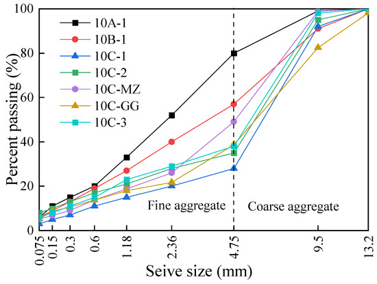 - Referring to the gradation range of DB45/T 1098-2014 [32], DB 36/T 744-2013 [33], DG/TJ08-2109-2012 [34], DB11/T 916-2012 [35], DB13/T 1013-2009 [36], and DB14/T 160-2015 [37], it was named 10C, and three gradations were selected and named 10C-1, 10C-2, 10C-3. Referring to the specific engineering gradation of Minzu (MZ) Avenue and Guigang (GG) Expressway, two gradations were selected and named 10C-MZ and 10C-GG.