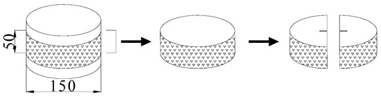 The process of preparing the LT-SCB test specimen is shown in Figure 4. The test was conducted according to AASHTO TP 105-13 [40], with an initial load of 1 ± 0.1 kN and a loading speed of 0.6 mm/min to ensure the contact between the specimen and the loading device. After reaching the initial load, the load was continuously applied at a loading speed of 5.0 mm/min until the end of the test. The test was terminated when the first load below 0.5 kN was recorded or when the displacement transducer reached its maximum range. Four parallel specimens were tested for each group. The fracture energy (Gf) and fracture toughness (KIC) were calculated according to the specifications.