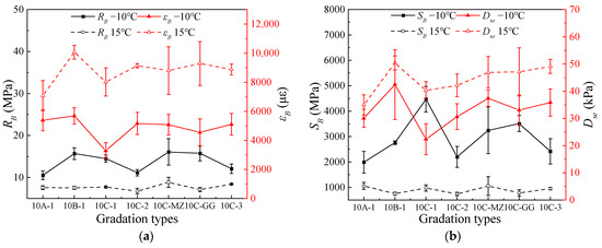 (b) The εB and Dse of different gradation mixtures were different. These values indicated the deformation and energy required for the failure of the asphalt mixtures under load. As shown in Figure 9, at −10 °C, the maximum difference in εB was 2397.5 με, and the maximum difference in Dse was 20.06 kPa. At 15 °C, the maximum difference in εB was 2994.3 με, and the maximum difference in Dse was 15.34 kPa. The 10B-1 had the highest values of εB and Dse at both temperatures, indicating that it had superior performance among the gradations.