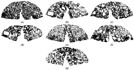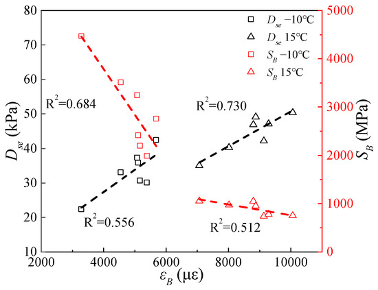 (a) The variation of RB, εB, SB, and Dse with gradation was inconsistent (as shown in Figure 7). As shown in Figure 8, there was a positive correlation between εB and Dse, while there was a negative correlation between εB and SB. εB reflected the deformation resistance ability of the asphalt mixture, and Dse reflected the energy absorption ability of the material during the failure process. Both of them reflected the viscoelastic failure characteristics of the asphalt mixture, so they had a positive correlation. SB was more suitable for the assessment of brittle failure, which was inconsistent with the failure mechanism of the asphalt mixture, so it had a negative correlation. In summary, εB and Dse were recommended as indicators for evaluating the performance of asphalt mixtures.