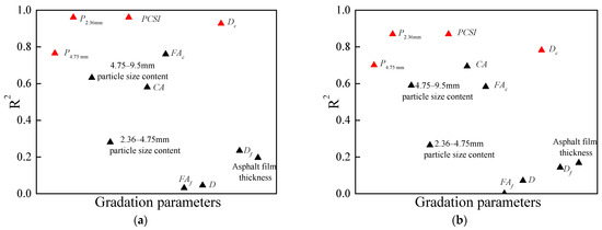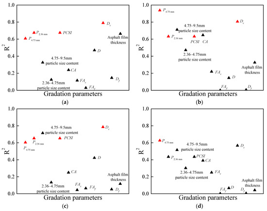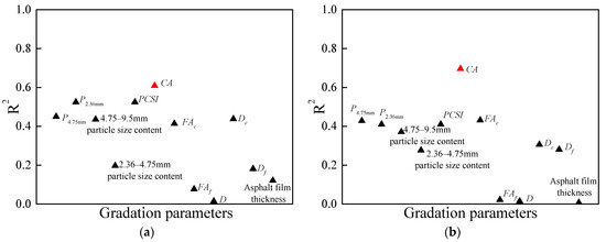 (c) Correlation analysis of the gradation parameters with R and CRI showed that different gradation parameters affected the performance of the asphalt mixture to different degrees. As shown in Figure 24, the CA had the highest correlation coefficients with R and CRI, with values greater than 0.6. This indicated that CA was an important factor affecting the performance of the asphalt mixture. Therefore, CA was selected as the main parameter of gradation change to further explore its influence on the performance of the asphalt mixture.