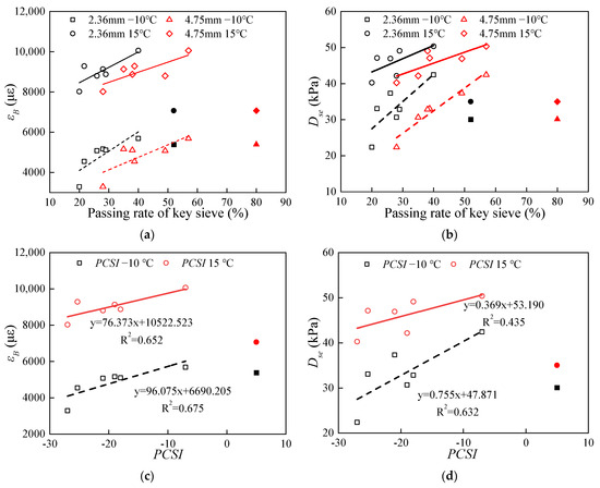 (c) There were differences in the correlation between the gradation parameters and the εB and Dse. The R2 value of the linear regression of the same gradation parameter at different temperatures was also different. As shown in Figure 10, the P4.75mm, P2.36mm, PCSI, and Dc had strong correlations with εB and Dse at −10 °C. At 15 °C, the P4.75mm had a better correlation with εB and Dse, while the P2.36mm, PCSI, and Dc had a better correlation only with εB. For a more comprehensive analysis, the P4.75mm, P2.36mm, PCSI, and Dc were chosen to further analyze the effect of gradation.