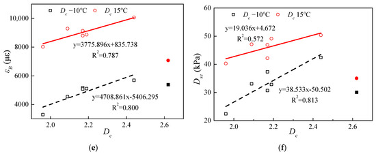 Correlation of gradation parameters with εB and Dse at −10 °C and 15 °C. (a) Passing rate of key sieve with εB. (b) Passing rate of key sieve with Dse. (c) PCSI with εB. (d) PCSI with Dse. (e) Dc with εB. (f) Dc with Dse.