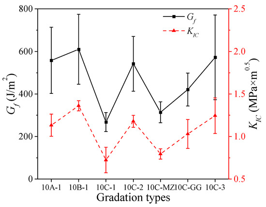 (b) The Gf and KIC of different gradation mixtures were different. The gradations of 10A-1 and 10B-1 had higher values of Gf and KIC, indicating better resistance to load-induced damage. As shown in Figure 12, the maximum difference in Gf between the gradations was 342 J/m2, and the maximum difference in KIC was 0.637 MPa·m0.5, with a maximum difference of 56.07%. The gradation of 10B-1 had the highest Gf and KIC, while the gradations of 10C-1 and 10C-3 had the lowest values, suggesting that there might be considerable variability within the same gradation range.