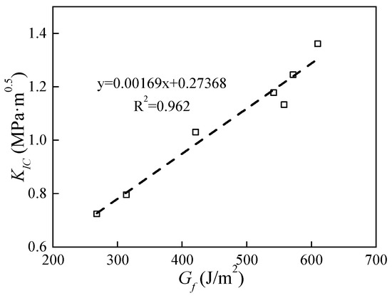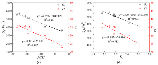 (a) Both the Gf and KIC of the asphalt mixture were influenced by its gradation (as shown in Figure 12). These two parameters showed a similar trend and magnitude for different gradations. Furthermore, a strong linear correlation (R2 = 0.962 and p-value < 0.01) between the Gf and KIC was observed, as shown in Figure 13. The higher the values of Gf and KIC, the better the performance and crack resistance of the asphalt mixture. Therefore, Gf and KIC were recommended as indicators for evaluating the quality of the asphalt mixture.