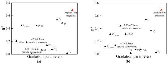 (c) There were differences in the correlation between the grading parameters and the Gf and KIC. As shown in Figure 14, the asphalt film thickness had the best correlation with Gf and KIC, with R2 values of 0.6873 and 0.6916, respectively. These values were both greater than 0.6, indicating a strong linear relationship. Therefore, the asphalt film thickness was selected as a parameter to further analyze the effect of gradation changes on the performance of the asphalt mixture.