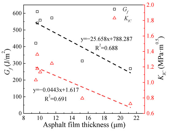 (d) The Gf and KIC of the asphalt mixture decreased as the asphalt film thickness increased (as shown in Figure 15). The reason for this was that when the asphalt film thickness reached a certain value, further increasing the thickness would result in some free asphalt inside the mixture, which made the mixture more susceptible to damage at low temperatures.