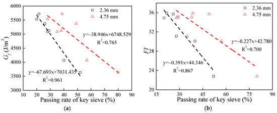 (a) The gradation of the asphalt mixture influenced both the Gf and FI (as shown in Figure 16). A good linear correlation between these two parameters was observed, with R2 = 0.843 p-value < 0.01 (as shown in Figure 17). These results indicated that the Gf and FI of the asphalt mixture change in the same way with the gradation variation. Therefore, Gf and FI were recommended as evaluation indicators.