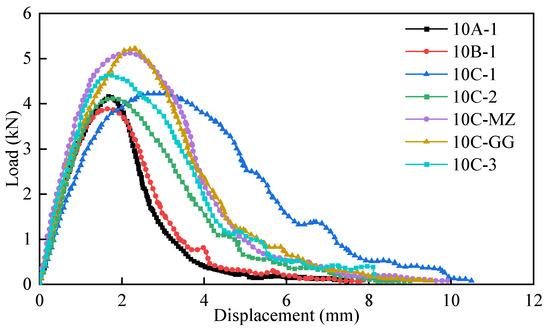 The process of preparing the CE-SCB test specimens is shown in Figure 5. The test was conducted according to EN 16697-44-2010 [41] and AASHTO TP 124-16 [42], with an initial stress of 0.1 ± 0.01 kN applied to the specimens by a linear loading control system at a loading rate of 0.05 kN/s. After reaching the initial load of 0.1 kN, the test was carried out at a displacement rate of 50 mm/min by the linear loading control system. The test was terminated when the load dropped below 0.1 kN. Four parallel specimens were tested for each group. The Gf and flexibility index (FI) parameters were calculated according to the specifications.