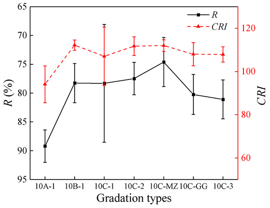 (b) The gradation of the asphalt mixture had an effect on the R and CRI. The R and CRI indicated the resistance of the asphalt mixture to damage under loading. As shown in Figure 22, the gradation range of 10A had the highest R and CRI, indicating the worst performance in terms of damage resistance. The gradation ranges of 10B and 10C had lower R and CRI, indicating better performance in terms of damage resistance. Among them, the gradation of 10A-1 had the highest R with a value of 14.59%, while the 10C-MZ gradation had the lowest value. The CRI had the lowest value for the gradation of 10A-1 and the highest value for the gradation of 10B-1 with a difference of 18.1%. Therefore, it can be concluded that the gradation range of 10A had unsatisfactory performance, while the gradation ranges of 10B and 10C had better performance.