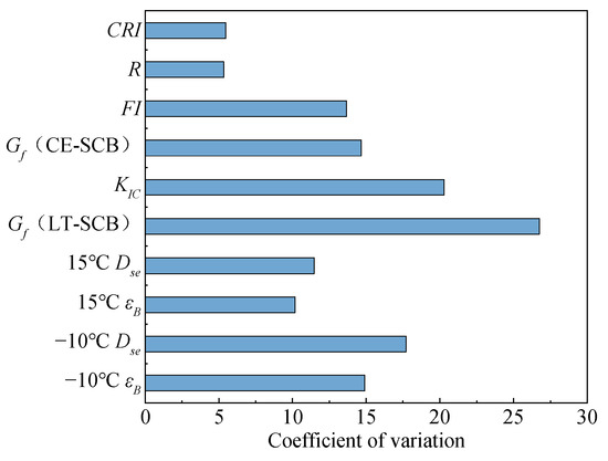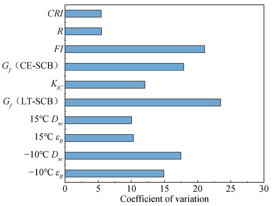 To evaluate the crack resistance of asphalt mixtures more effectively, this paper used the coefficient of variation as a measure of data dispersion. The coefficient of variation is the ratio of the standard deviation to the mean value. The lower the coefficient of variation, the more stable and reliable the parallel test data are. The higher the coefficient of variation, the more dispersed and uncertain the parallel test data are. This paper analyzed the coefficient of variation for the parallel test results of different tests, as shown in Figure 26.