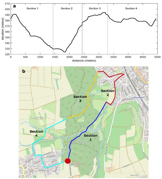 Elevation profile (a) and selected route (b) of the test track. The test track was divided into four sections highlighted with colours in the map. The red dot represents the start and end point. (Source of (b): map data ©OpenStreetMap contributors (ODbL) [60]).