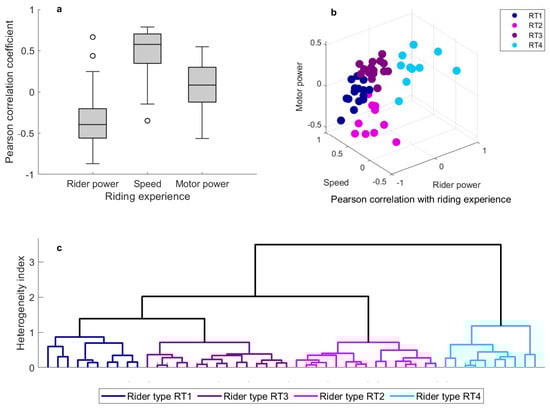 Boxplots of the Pearson correlation coefficients of the riding experience against the rider power, speed and motor power including N = 50 riders (a). Relation of the Pearson correlation coefficients of riding experience against rider power, speed and motor power, respectively (b). Dendrogram of the derivation of rider types resulting from hierachical cluster analysis (c). RT1(N = 10); RT2(N = 15); RT3(N = 15); RT4(N = 10).