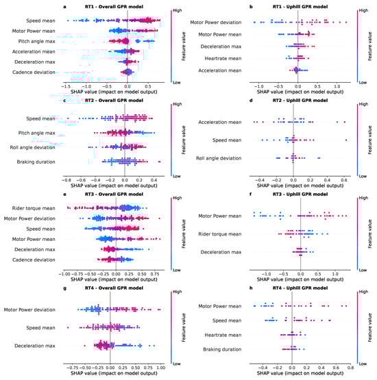 Feature importance based on SHAP values. In the beeswarm plot, the features are sorted according to their impact on riding experience. Positive SHAP values indicate a positive contribution of a feature to riding experience, while negative SHAP values indicate a negative contribution. The colour displays the original feature value from high to low. The feature importance of the overall GPR models are displayed in the subfigures (a) RT1, (c) RT2, (e) RT3 and (g) RT4. The feature importance of the uphill GPR models are displayed in the subfigures (b) RT1, (d) RT2, (f) RT3 and (h) RT4.