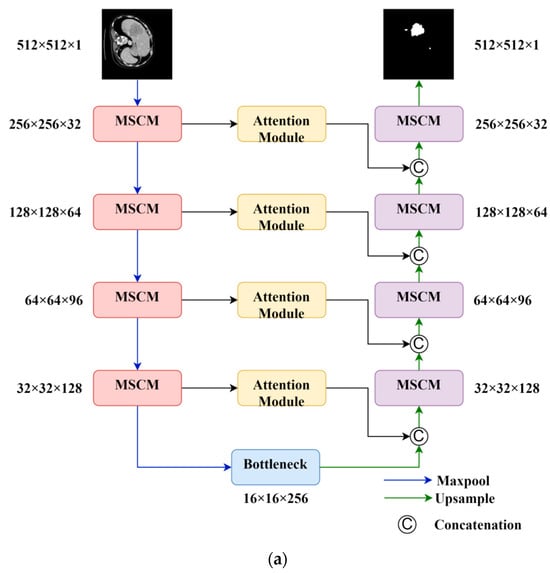 In this section, we take full advantage of the attention mechanism in neural networks, which gives greater weight to focused areas, to address the issues of missing small targets and unclear target boundaries in CT images. We propose an image segmentation method based on the U-Net architecture, incorporating residual [27] as the foundation and multi-scale convolution. We propose a new attention module that combines the attention mechanism and the residual network, effectively increasing the weight of small tumor objects in the image. The network architecture is shown in Figure 2.