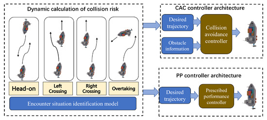 This section describes a CASC, and the structure of the CASC is shown in Figure 2. A dynamic calculation of collision risk (DCCR) is introduced to evaluate the risk of collision. Based on the COLREGs, this paper classifies four encountering situations of two vessels: the head-on situation, the left crossing situation, the right crossing situation, and the overtaking situation are considered [32,33]. More details of the encountering situations can be found in rules 13, 14, and 15 of the COLREGs [34,35], which are depicted in Figure 3. Based on the DCCR analysis, a switch control strategy is employed. A collision-avoidance controller (CAC) and a prescribed performance controller are designed, and the stability of the control system is proven.