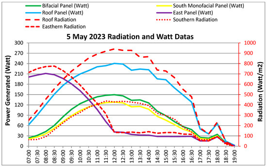 The data collected from the experiment conducted on 5 May 2023, between 7:00 a.m. and 7:00 p.m., with intervals of 30 min, regarding solar radiation (W/m2) and electricity energy production (W), are presented in Figure 4. On the east-facing panel, the power generated in the early hours of the day reached 211.3 W at 8:00 a.m. and then decreased toward 12:00 p.m. The electrical efficiency of the panel placed on the east facade was found to be an average of 15.98% daily. The total energy produced daily was 1.09 kWh.