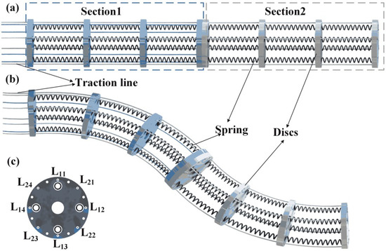 Structure of a continuum tendon-driven robot. (a) Schematic diagram of the robotic arm model in the natural state; (b) Schematic diagram of the robotic arm model in the driven state; (c) Cross-sectional schematic diagram of the robotic arm model. Among them, represents the number of the driving lines, represents the robotic arm, and represents the driving lines.