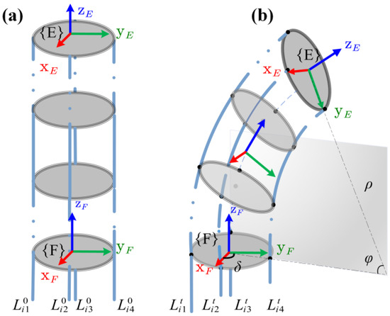Due to the arrangement of the tendons (discs and springs), the robotic arm is driven in line, and these continua exhibit a telescopic movement or bend into a circular shape. Therefore, the continuum arm’s central axis can be described in space precisely as a circular arc with a variable radius of curvature and length. As shown in Figure 2a, the diagram on the left shows the state of the continuum arm of the section when it is not driven, i.e., . The central axis of the disc is a straight line with four drive lines of length . After the continuous manipulator is driven for time t, the state is shown in Figure 2b. The line length becomes . Let the change in rope length between the driven state and the undriven state be , as shown in Equation (6).