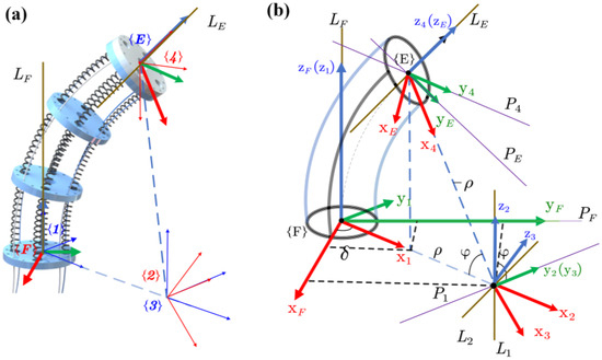 As shown in Figure 4, three identical single-section robotic arms are connected in series to form an overall number: . Then, the central axis is the z-axis direction on the front-end disk of this multi-section robotic arm. Next, establish a coordinate system and record it as {F}, and set up a coordinate system on the end disc with the central axis as the direction of the z-axis and record it as {E}. Assume that the center point at the top of the segment is , which is expressed as in the coordinate system .