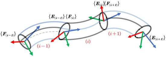 The coordinate system of a multi-section continuous robot in a driven state. represents the coordinate system at the front end of the continuous robot in the first section, while represents it in the second section. Due to physical model limitations, the -th manipulator’s front-end coordinate system differs from the -section robot arm, but and remain the same. Thus, a total of coordinate systems are needed for the -section robotic arm.