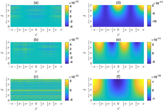 The two-section driven manipulator contains four driving variables: , , and . The spatial coordinates solved by the DH Taylor expansion series model are used as standard results to compare the errors in the results of the dual quaternion model and the DH model. (a) The dual quaternion model and the standard result solve the error in the x-coordinate direction between the coordinates. (b,c) are the errors in the y-axis and z-axis with the standard result, respectively. (d) The errors between the DH model solution coordinates and the standard result in the x-coordinate direction, (e,f), are the errors on the y-axis and z-axis, respectively.