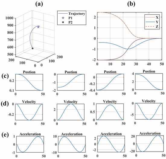 Use the fifth-order polynomial interpolation algorithm to plan the trajectory of the robotic arm and solve the problem of the end of the two-section continuous robot moving from point to point in space. (a) Schematic diagram of the motion trajectory of the two-section continuous robot. The path is planned through the fifth-order polynomial interpolation algorithm; that is, the continuous robot needs to move 50 steps from point to point according to the interpolation sequence. (b) The error between the continuous robot’s actual path and the algorithm’s path (c–e), respectively, represents the changes in the angle, angular velocity, and angular acceleration of the driving amount when the continuous robot moves from point to point and sequentially moves 50 interpolation trajectory points. The x-axis represents the 50 trajectory points.