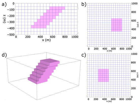 Synthetic test model 2 of simple geometric buried bodies with +1 g/cm3 density contrast, +1 A/m magnetization contrast (rose bodies) and −1 g/cm3 density contrast, −1 A/m magnetization contrast (blue body). (a) profile view at y = 250 m, (b) profile view at y = 700 m, (c) top view at z = 0 m and (d) 3D view.