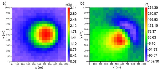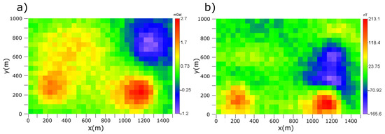 (a) Gravity anomaly (mGal) and (b) magnetic anomaly (nT) produced by test model 2 in Figure 7. The data were contaminated with Gaussian noise of 5% of the standard deviation in order to test the noise sensitivity of the inversion solutions.