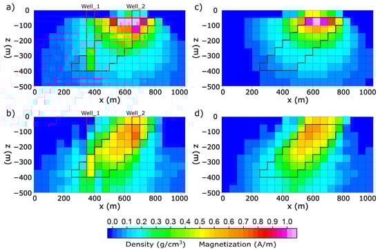 This experiment was performed with data contaminated by Gaussian noise to consider its effect on the inversion results. We considered hypothetical clipping information from two wells with real density values as a priori information for the gravity case the Well_1 at 350–400 m and Well_2 at 650–700 m on the x-axis in order to evaluate how the magnetic case improves with joint inversion. 40 iterations were run, and the stopping condition was convergence between models of less than 1%. The regularizers shared in standard separate (Equation (17)) and robust joint inversion functional (Equation (2)) were kept constant. For the joint inversion case, the “structural direction” regularizer was also used to indicate the strike and dip angles of the structure. Table 2 specifies the rest of the inversion parameters.