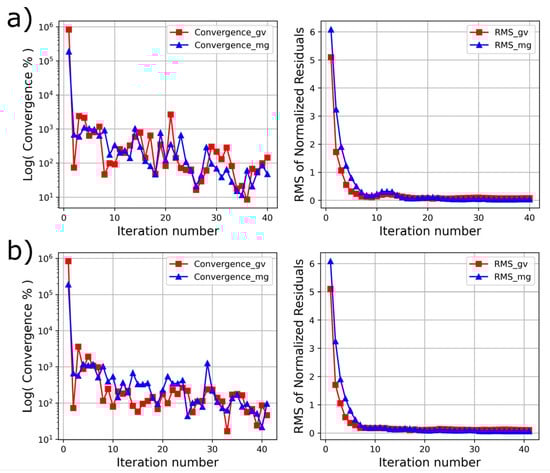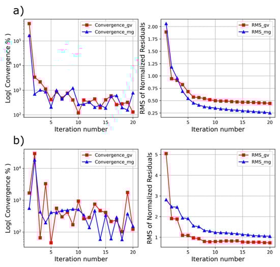 The following expressions [80] were used to evaluate the RMS of normalized residuals and the model convergence for each iteration for each data type: