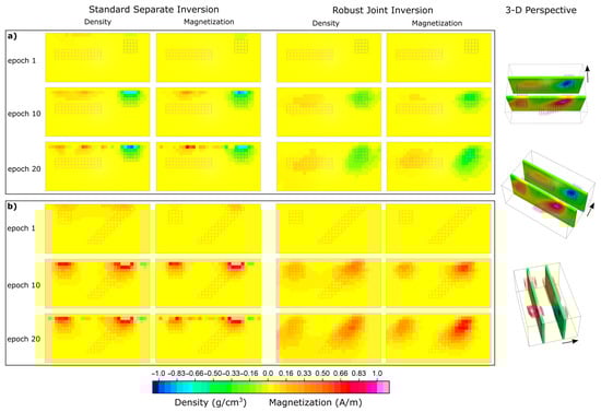 The results of the experiment at epochs 1, 10, and 20 are plotted in Figure 9 with a general color scale ranging from −1 to 1 g/cm3 and A/m for the gravimetric and magnetic case, respectively. Figure 10 also plots the model convergence of each iteration in percentage, which represents how much a model changes with respect to the past iteration and the RMS error of normalized residuals that reflects the mismatch between the input synthetic data and the data calculated from the inversion models of each iteration.