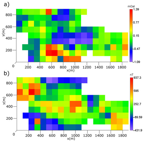 After corrections were performed to the raw data, the residual gravity anomaly was calculated by subtraction of the regional components from the observed complete Bouguer anomaly, and simultaneously, the regional magnetic field was subtracted from the observed magnetic anomaly data. After data reduction, we statistically interpolate the data using variograms to obtain better coverage of the study area and resample a regular mesh at 100 m of spacing, obtaining 128 data points for each (gravity and magnetic) method (Figure 12).