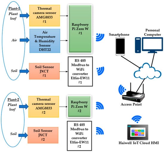 It is worth noting that two different plants are planted separately in the polybag or pot and placed close together in the experiments. This arrangement ensures the air conditions for both plants are the same. Thus, the air parameters can only be measured in Plant-1. However, the leaf temperature and soil parameters should be measured separately. As shown in Figure 1, the proposed SCADA system consists of the sensors, Raspberry Pi Zero W [50], RS485 Modbus to WiFi converter, Access point, Haiwell IoT Cloud HMI, Haiwell cloud, and a computer or smartphone for remote monitoring.