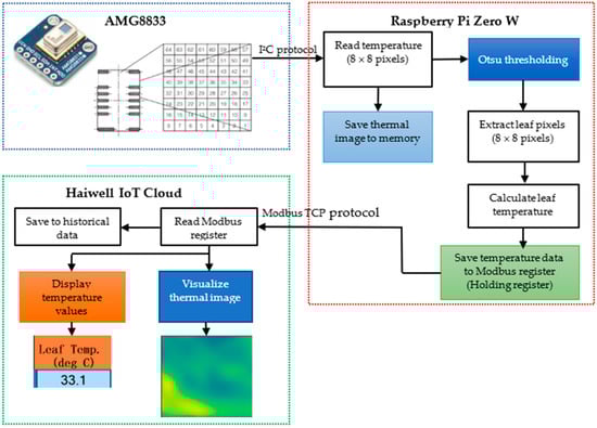 The schematic diagram of leaf temperature monitoring is illustrated in Figure 2. It consists of three units: an AMG8833 thermal camera, a Raspberry Pi Zero W single-board computer, and the Haiwell IoT Cloud HMI. The AMG8833 measures the temperature of the monitored object on the 8 × 8 pixels, as shown in the figure (top left). These temperature data are then read by the Raspberry Pi Zero W using the I2C protocol and converted to the thermal image. The image processing task can be performed once the data are in image format. It is worth noting that for the leaf temperature calculation using the Otsu thresholding, the pixel values are the original temperature data of the thermal camera. However, the pixel values of saved and displayed thermal images are converted to the heat-map color for easy visualization. The thermal image is also stored in the SDCard memory of the Raspberry Pi Zero W for data analysis.
