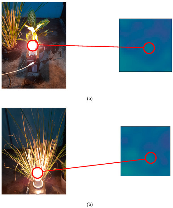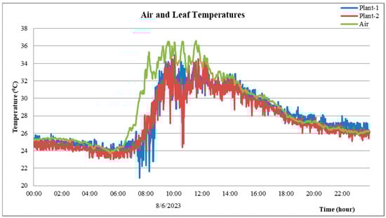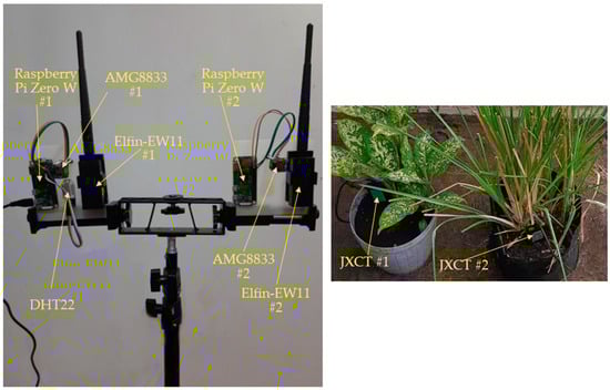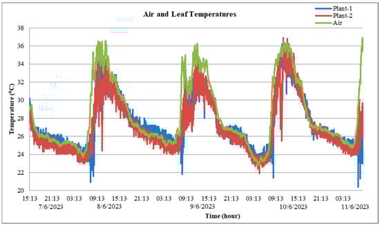 This work deals with some of the previously described categories, namely monitoring of plant leaf temperature and environmental parameters. Both leaf temperature and environmental parameters (air and soil) are essential for plant growth. Leaf temperature is indicative of the photosynthesis rate, leaf water loss, and stomatal conductance of a plant [5]. Leaf temperature can be measured using invasive and non-invasive sensors [6]. Since invasive sensors are impractical, a non-invasive method, such as using thermal cameras, is preferred [7,8,9,10,11,12,13]. A FLIR Vue Pro R thermal camera was used to measure the grapevine’s leaf temperature for calculating the crop water stress index (CWSI) [7]. The system added an RGB camera to capture the visible image, in which the image processing technique was employed to extract the leaf area. Then, the average temperature measured by the thermal camera was computed in the leaf area to calculate the CWSI. In [8], a FLIR P660 thermal camera was used for measuring the strawberry leaf surface temperature to define the temperature difference with the ambient air temperature in the night frost conditions. In [9], the FLIR C2 thermal camera was used to measure the leaf temperature of the cowpea plant. The temperature of the centric trifoliate leaf was extracted using the camera software to create the datasets. The datasets were compared with the data from the leaf porometer sensor to measure the leaf stomatal conductance.