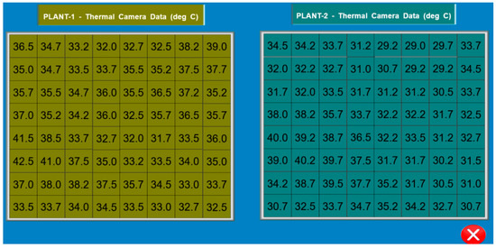 In order to be accessible by the HMI, the temperature data of the 64 pixel thermal image, leaf temperature, and background temperature are stored in the Modbus registers. In turn, the Haiwell IoT Cloud HMI reads the temperature data from the Raspberry Pi Zero W using the Modbus TCP protocol. The thermal image data are then visualized into the image as shown in Figure 2 (bottom Left), while the leaf temperature is displayed in numerical format.