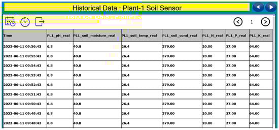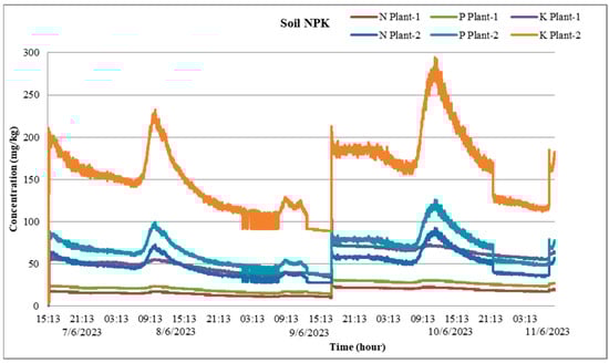 Figure 27 shows the recorded soil NPK data graphs, where the red, green, and purple lines represent the Plant-1 soil N, P, and K, respectively. The blue, aqua, and orange lines represent the Plant-2 soil N, P, and K, respectively. The figure shows that the soil NPK is higher for Plant-2 than Plant-1. This conforms with the fact that Plant-2 soil is in fertilizer soil, which has higher NPK concentrations than Plant-1 soil.