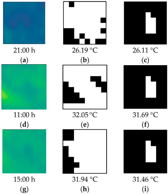 At first, we collect the images during the day to observe the variation in the leaf and background temperatures. The results from observation show that the temperature of leaf objects is always lower than the background. This can be analyzed from the fact that the temperature of concrete and soil of the background tend to be higher than the air temperature. Since the experiments are conducted in a tropical climate where the daily temperature ranges from 20 to 40 °C, the leaf temperature will be lower than the background (concrete and soil) temperature. Based on this observation, we define the leaf temperature by a simple image segmentation using the Otsu thresholding.
