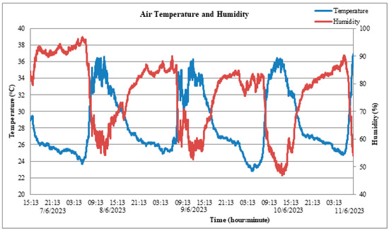 Air temperature and humidity are the typical air parameters to be monitored. This work uses the DHT22 to measure air temperature and humidity. It is similar to the DHT11 but has superior accuracy. In the DHT22, the temperature is measured by a thermistor, and a capacitive humidity sensor measures the humidity. This sensor compensates for temperature and is calibrated. The DHT22 specifications are given in Table 3 [53].